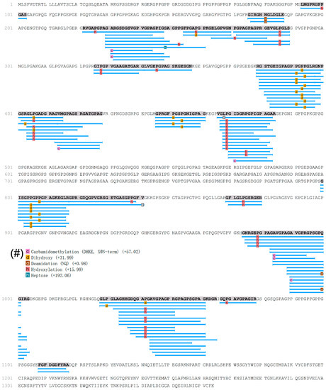 Sequence of collagen α-2(I) (P02465|CO1A2_BOVIN Collagen α-2(I) chain) and the distribution of identified peptides. (#) Post-translational modification of proteins in collagen α-2(I), “c”: carbamidomethylation; orange “d”: dihydroxy; brown “d”: deamidation; pink “h”: hydroxylation; and green “h”: heptose.