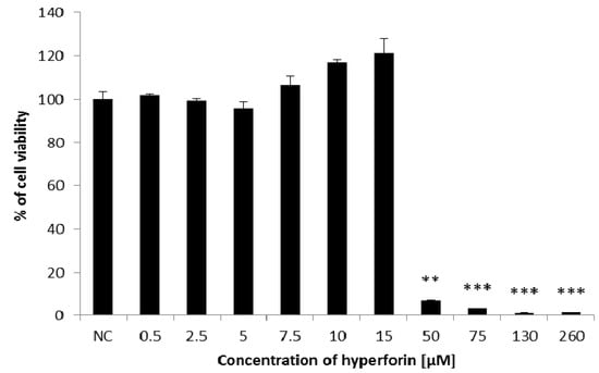 Determination of HF cytotoxic effects towards HepG2 cells using the MTT assay. Data shown are mean ± SD of three repeated experiments. NC = negative control. Comparison with negative control: ** 0.001 < p <0.01; *** p < 0.001.
