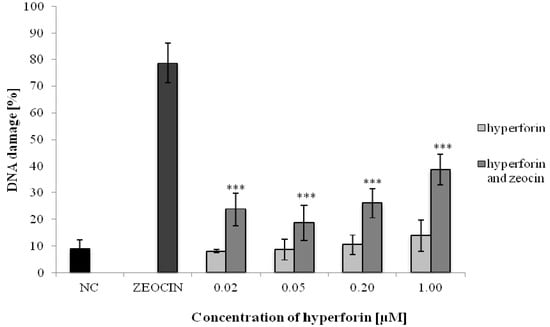 Determination of HF antigenotoxic effects on human lymphocytes using the alkaline comet assay. Data shown are mean ± SD of three repeated experiments. NC = negative control; ZEOCIN = positive control. Comparison with positive control (ZEOCIN): *** p < 0.001.