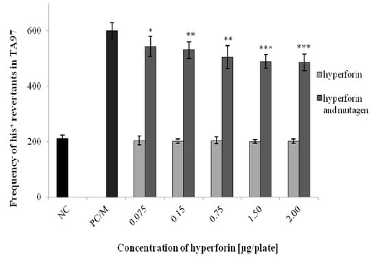 Determination of HF antimutagenic effects using the Ames test—strain Salmonella typhimurium TA97. Data shown are mean ±SD of three repeated experiments. NC = negative control; PC/M = positive control = mutagen = (9-aminoacridine). Comparison with positive control (PC/M): * 0.01 < p < 0.05; ** 0.001 < p < 0.01; *** p < 0.001.