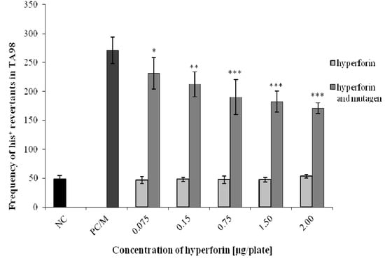 Determination of HF antimutagenic effects using the Ames test—strain S. typhimurium TA98. Data shown are mean ±SD of three repeated experiments. NC = negative control; PC/M = positive control = mutagen = (4-nitroquinoline-1-oxide). Comparison with positive control (PC): * 0.01 < p < 0.05; ** 0.001 < p < 0.01; *** p < 0.001.