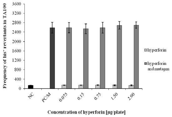 HF is one of the major components of H. perforatum (St. John’s wort), responsible for many health-promoting activities [16]. Since it has been demonstrated that HF exhibits antioxidant properties [17], it was a high probability that it could exhibit also antigenotoxic activities. To the best of our knowledge, this was the first time the potential antigenotoxicity of HF was examined at three different levels simultaneously; primary/promutagenic DNA lesions, gene mutations, and chromosome aberrations.