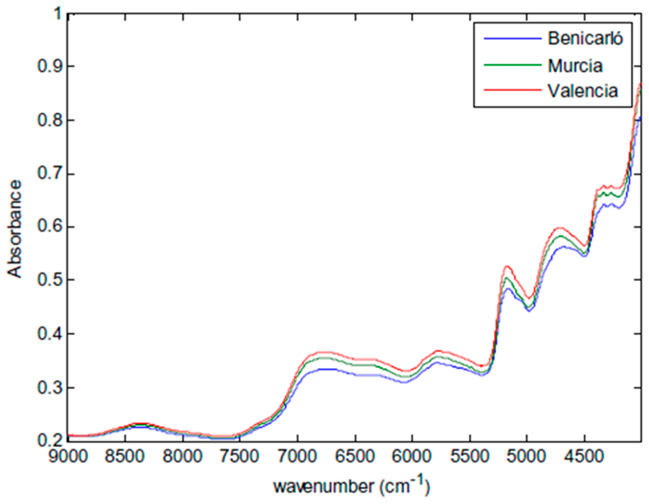 Mean near-spectra of artichoke samples from three different Spanish origins: Castellon (Alcachofa de Benicarló), Valencia and Murcia. Reproduced with permission from [32] published by Elsevier, 2016.