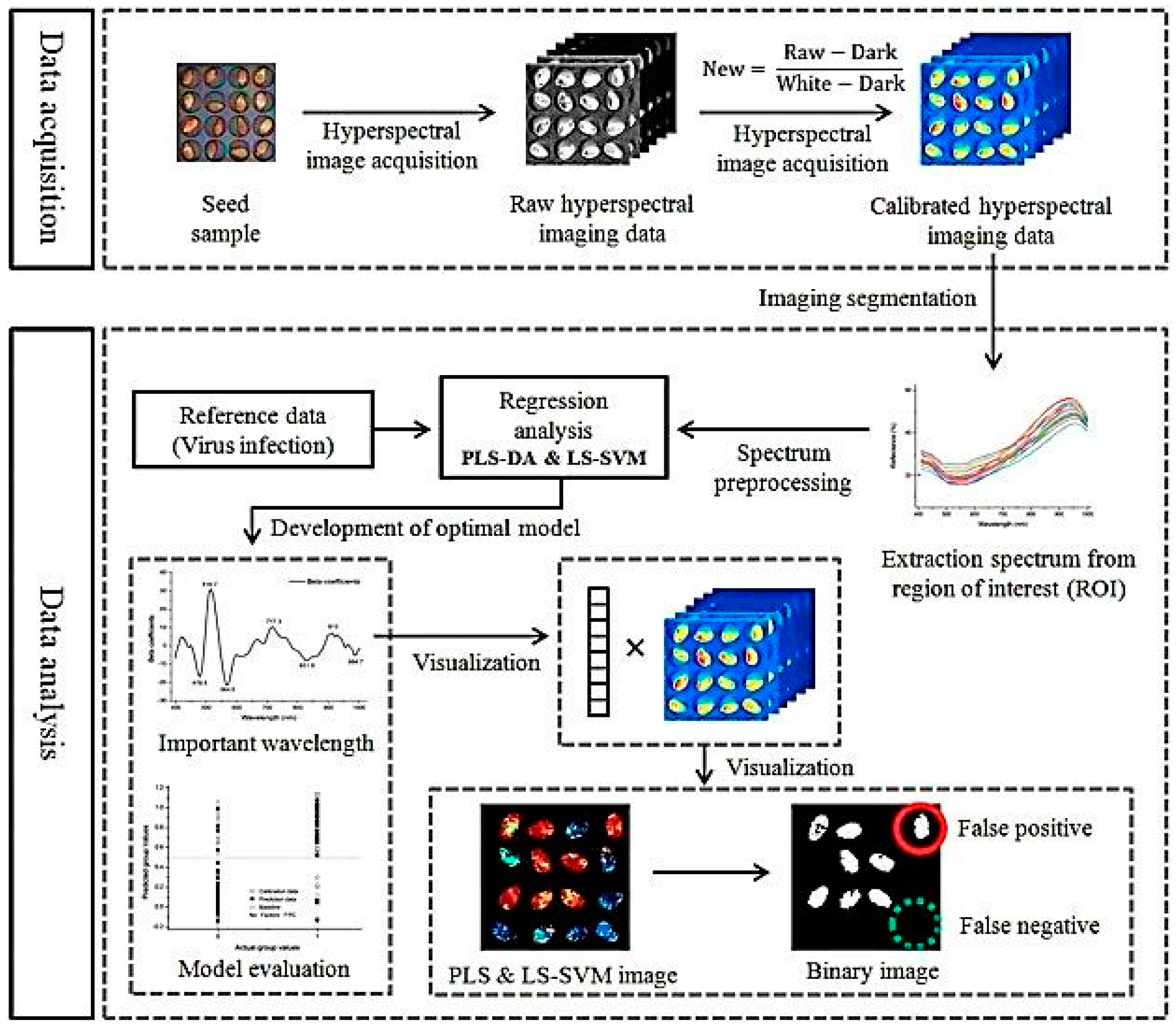 Figure 4. Flow work of hyperspectral imaging for detection of cucumber green mottle mosaic virus-infected watermelon seeds. Reproduced with permission from [57] published by Elsevier, 2016.