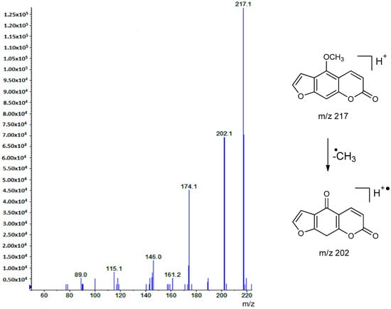 To obtain results on the structural diversity of coumarin-type components in plant extracts, an LC-MS2-based method was developed to detect the possible presence of 39 commercially available coumarins (31 standard compounds) and furocoumarins (8 standard compounds), which are characteristic of species from the Rutaceae family [,,,,]. For each reference compound, a relevant transition of the precursor-to-product ions were detected with the utilization of the multiple reaction monitoring (MRM) mode. Using APCI source operating in positive mode, the precursor ion [M + H]+ for each of the 39 analytes was determined in MS1 full scan tests and the product ions in MS/MS experiments. MRM transitions of each analyte were optimized using direct infusion with the following MS/MS parameters; declustering potential (DP), entrance potential (EP), collision cell entrance potential (CEP), collision energy (CE), and collision cell exit potential (CXP) (Table 1). Retention times of reference compounds were determined by LC-MS2 analysis in the multiple reaction monitoring (MRM). Retention times of the 39 coumarin-type components are also indicated in Table 1. Mass spectra of standard components were performed by the MRM mode followed by an enhanced product ion (EPI) scan, triggered by information dependent acquisition (IDA) criteria. The fragmentation behavior of coumarins and furocoumarins was consistent with previous data reported in the literature [,,,,,]. Under collision-induced dissociation (CID), these compounds undergo neutral loss from pseudo-molecular ions [M + H]+, producing the corresponding high-abundance fragment ions: [M + H − CO]+, [M + H – CO − CO]+, [M + H − CO2]+, [M + H − C5H9O]+, [M + H − C5H8]+, [M + H − C5H8 − CO2]+, [M + H − CH3]+, and [M + H − 2CH3]+. For instance, the main ions (base peak) found on the mass spectra of the furocoumarin xanthotoxin was seen at m/z 217 [M + H]+ in Q1 and the predominant ion at m/z 202 ([M + H − CH3]+ (Figure 1).