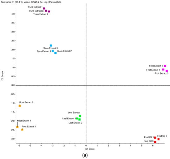(a) Scores plot of principal component analysis and discriminant analysis (PCA-DA) of the Z. zanthoxyloides extracts (fruit, leaf, stem, root, trunk) and fruit essential oils analyzed using LC-MS/MS in the MRM mode; (b) Scores plot of PCA-DA of coumarins and furocoumarins detected in Z. zanthoxyloides samples using LC-MS/MS in the MRM mode.