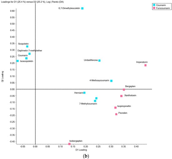 In order to provide an evaluation of the variability of in Z. zanthoxyloides samples, essential oils and solvent extracts of each plant part were analyzed by LC-MS/MS, and MRM chromatograms were processed using PCA-DA. Targeted LC-MS profiles of the data set revealed separate clusters for essential oils and extracts, on the one hand, and differences associated with the plant parts, on the other hand. The PCA-DA analyses were based on calculations of intensity mean and standard deviation among the three replicates (methanolic extraction of each plant part collected on three distinct trees) of each peak, detected using scheduled MRM (Table S1). Using this statistical analysis, the scores plots of different Z. zanthoxyloides samples are displayed in Figure 3a. The principal factorial plane (constructed using D1 and D2) accounted for 50.6% of the entire variance of coumarins in plant samples. The fruit samples (essential oils and extracts) are correlated positively with the D1 axis (25.4%), whereas the extract samples of all other plant parts are negatively located on the D1 axis. Note that the trunk and stem samples are located in the same PCA space region, positively correlated with the D2 axis (25.2%), whereas the stem and root extract samples (located in the same quadrant) are negatively correlated with this axis. This indicates a potential differentiation of coumarin composition according to the Z. zanthoxyloides plant parts. The corresponding loading plot in Figure 3b shows the coumarins that make the most difference in separating samples. Characteristic marker components were identified to be responsible for clustering samples such as furocoumarins for fruit samples (essential oils and extracts) or scopoletin and isoscopoletin for trunk extracts.