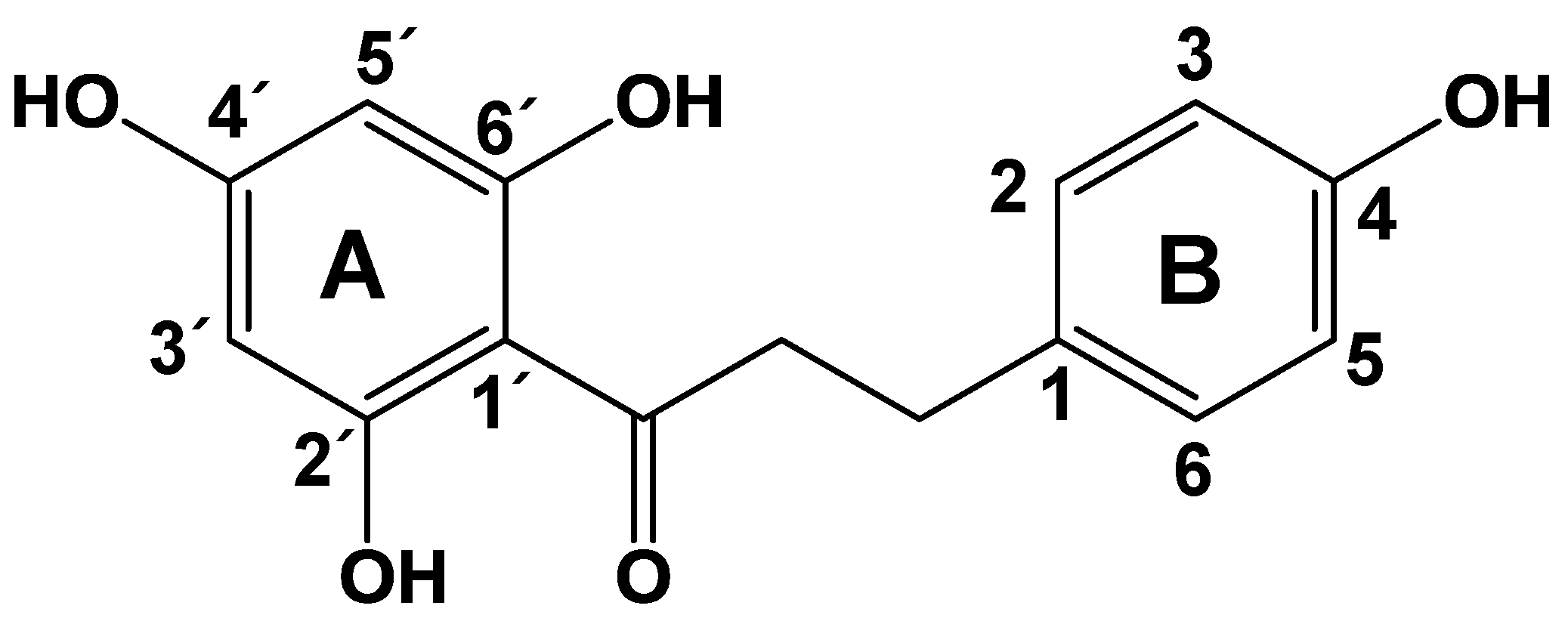 Flavonoids are a class of polyphenolic compounds found in the human diet, mainly in fruits, vegetables, legumes, cereals, spices, nuts, and plant-derived foods, such as tea, coffee, and red wine. Dietary polyphenols exhibit a broad spectrum of pharmacological activities [1,2,3]; flavonoids are well-known for their antioxidant, anti-tumor, antimicrobial, antiviral, and anti-inflammatory activities [4]. Phloretin (3-(4-hydroxyphenyl)-1-(2,4,6-trihydroxyphenyl) propan-1-one) (Figure 1) is a dihydrochalcone with a C6–C3–C6 backbone. It is a natural compound abundant in apples (mostly in the peel) and in apple leaves, where it is present in either a free form or the glucosidic form phloridzin (phloretin 2′-O-glucose) [5,6,7,8]. Glycosylated derivatives of phloretin are mostly converted to the free form in the small intestine by hydrolytic enzymes [9]. Phloretin has many biological functions, including anti-oxidative and anti-cancer activities, and has been linked to the prevention of cardiovascular disease [10,11]. It was also shown to inhibit the production of inflammatory chemokines, cytokines, and differentiation factors induced by activated leukocytes in the innate immune response [12]. It was previously reported that phloretin treatment inhibits the expression of nuclear translocation of nuclear factor (NF)-κB subunit p65 and mitogen-associated protein kinase (MAPK) phosphorylation in LPS-stimulated RAW264.7 cells [13].