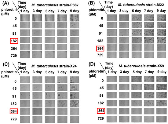 Effects of phloretin on the growth of (A) M. tuberculosis P887 (H37Rv); (B) M. tuberculosis M22 (multidrug resistant); (C) M. tuberculosis X24 (extensively drug resistant); and (D) M. tuberculosis X59 (extensively drug resistant) strains. Red squares denote the MIC90 for each strain.