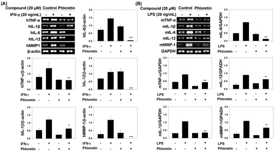 Effects of phloretin on mRNA expression of inflammatory cytokines (A) tumor necrosis factor (TNF)-α, interleukin (IL)-1β, IL-6, IL-12, matrix metalloproteinase (MMP)-1, and β-actin in interferon (IFN)-γ-treated MRC-5 cells and their quantitative analysis of reverse transcription polymerase chain reaction results; and (B) TNF-α, IL-1β, IL-6, IL-12, MMP-1, and Glyceraldehyde 3-phosphate dehydrogenase (GAPDH) in LPS-treated dendritic cells and their quantitative analysis of reverse transcription polymerase chain reaction results. Cells were untreated (negative control) or stimulated with 20 ng/mL IFN-γ for MRC-5 cells and 20 ng/mL LPS for dendritic cells in the presence or absence of phloretin for 3 h. Relative expression was quantified using ImageJ, and bars represent mean expression level ± standard deviation relative to β-actin for IFN-γ-treated MRC-5 cells and GAPDH for LPS-treated dendritic cells. * p < 0.05, ** p < 0.005, *** p < 0.001 vs. cells treated with IFN-γ or LPS only.