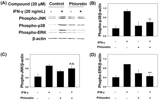 JNK, p38 MAPK, and ERK expression in MRC-5 cells pretreated with phloretin and stimulated with interferon (IFN)-γ. (A) MAPK levels were evaluated by Western blot, with β-actin used as a loading control; (B–D) relative intensities of phosphorylated JNK, p38 MAPK, and ERK normalized to β-actin, respectively. Data represent mean ± standard deviation. ** p < 0.005, *** p < 0.001 vs. cells treated with IFN-γ only.