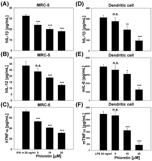 Levels of (A) interleukin (IL)-1β; (B) IL-12; and (C) tumor necrosis factor (TNF)-α in the culture medium of interferon (INF)-γ-stimulated MRC-5 cells; and (D) IL-1β; (E) IL-6; and (F) tumor necrosis factor (TNF)-α in the culture medium of lipopolysaccharide-stimulated dendritic cells treated with indicated concentrations of phloretin for 24 h. Data represent mean ± standard deviation of three independent experiments. * p < 0.05, ** p < 0.005, *** p < 0.001 vs. cells treated with IFN-γ only (A–C) or LPS only (D–F).