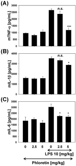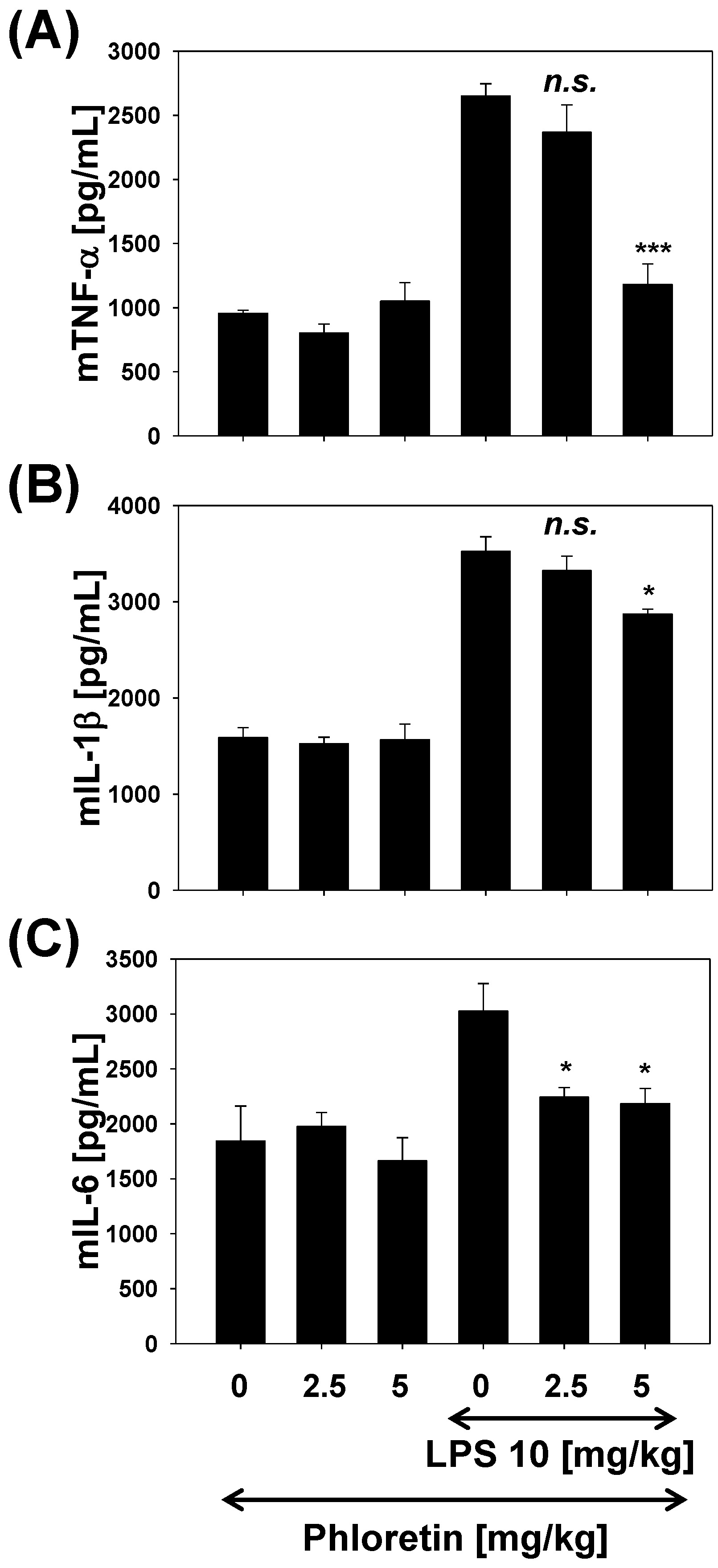 In order to demonstrate the potency of phloretin as an anti-inflammatory agent in lung inflammation, we investigated the effects of phloretin on inflammation in vivo. We measured the effect of phloretin on the production of pro-inflammatory cytokines TNF-α, IL-1β, and IL-6 in lung homogenates from 10 mg/kg LPS-stimulated mice (Figure 6). At 2.5 and 5 mg/kg, phloretin inhibited TNF-α production in vivo by 11% and 56%, respectively (Figure 6A); IL-1β by 6% and 19%, respectively (Figure 6B); and IL-6 by 26% and 28% (Figure 6C), respectively.