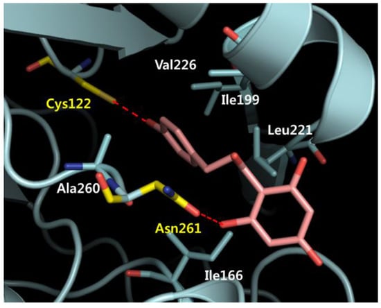 A docking analysis revealed hydrogen bonding networks between the Asn261 of mtKASIII and the 2′-hydroxy groups of the A-ring of phloretin and between the Cys122 of mtKASIII and the 4′-hydroxy groups of the B-ring of phloretin (Figure 9). The B-ring of phloretin formed additional hydrophobic interactions with Ile166, Ile199, Leu221, Val226, and Ala260 of mtKAS III. Our current results indicate that phloretin exhibited strong binding to mtKASIII, mainly via hydrogen bonding and hydrophobic interactions, which may contribute to the inhibition of initial type II fatty acid elongation step by mtKASIII in M. tuberculosis. These results confirmed that mtKASIII can be a potential target for novel anti-TB agents.