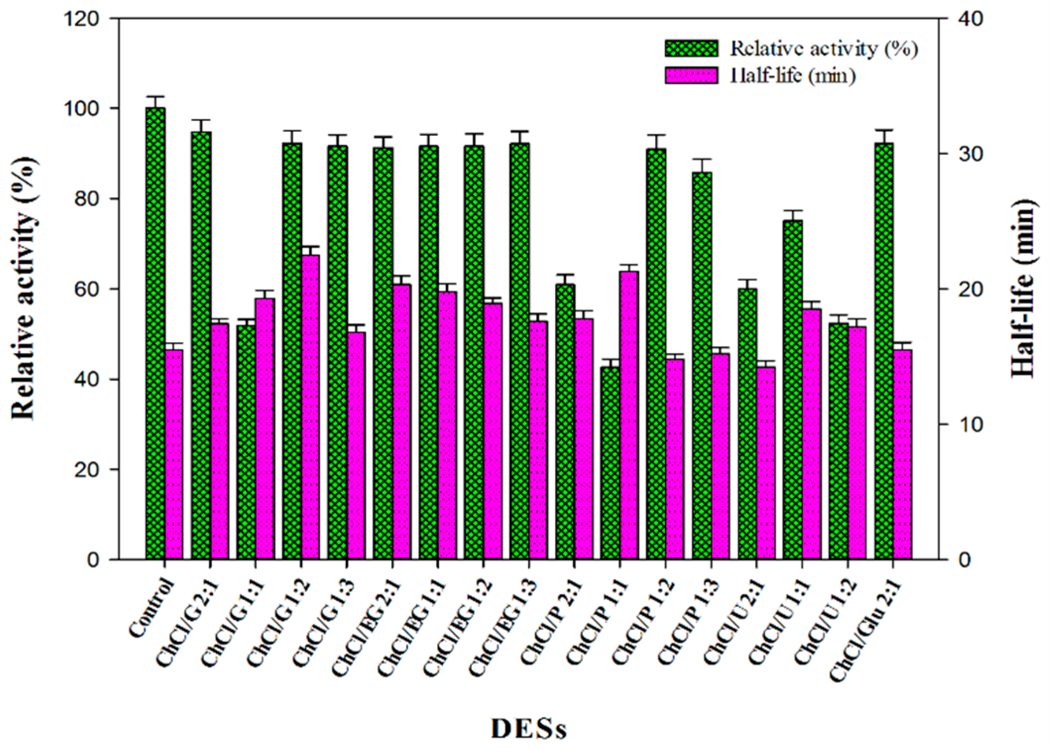 Activity and thermal-stability of β-d-glucosidase in phosphate buffer (0.1 M, pH 5.8) containing different DESs (20 vol %). The relative activities (%) refer to the percentages of the initial reaction rates obtained by the enzyme in the deep eutectic solvents (DES)-containing aqueous solutions relative to the one obtained in the pure buffer. The half-life (min) of the enzyme were obtained at 65 °C.
