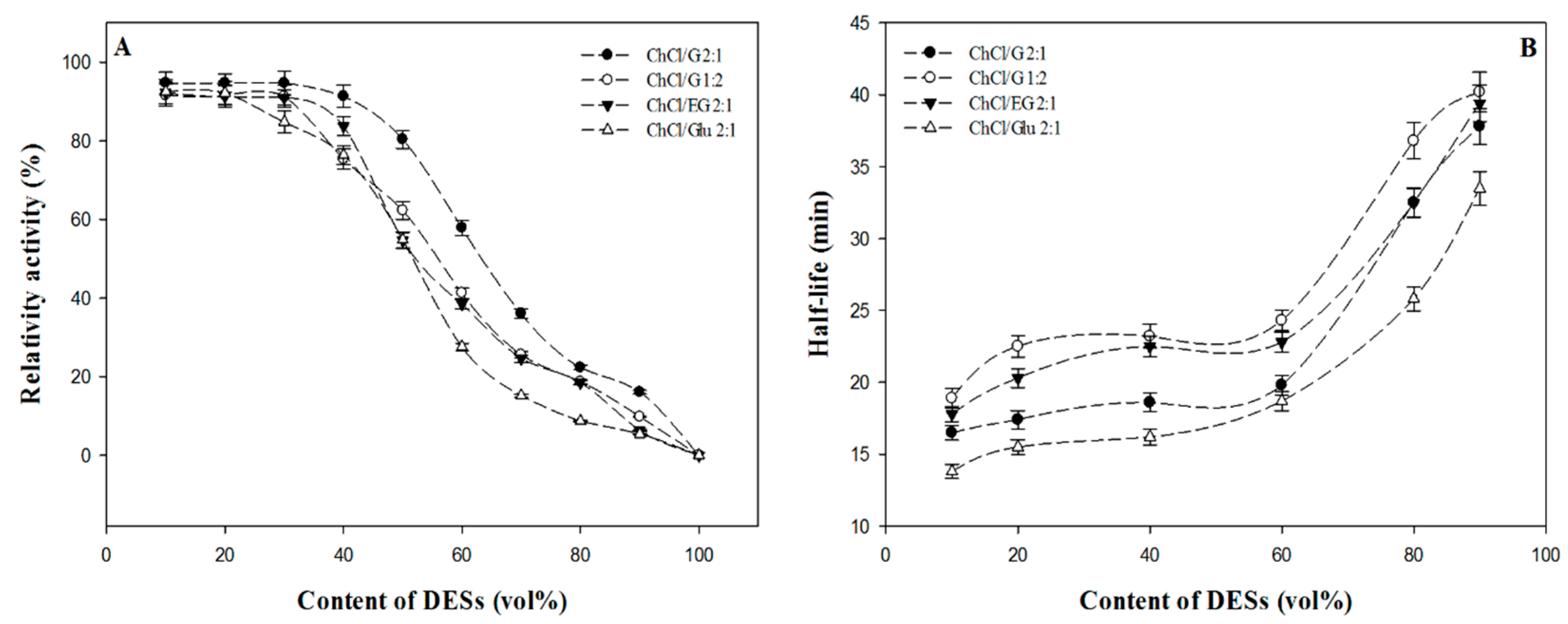 Variation of β-d-glucosidase activity (A) and half-life (B) in the four typical DESs (ChCl/G 2:1; ChCl/G 1:2; ChCl/EG 2:1 and ChCl/Glu 2:1) with different concentration. The half-life (min) of the enzyme were obtained at 65 °C.