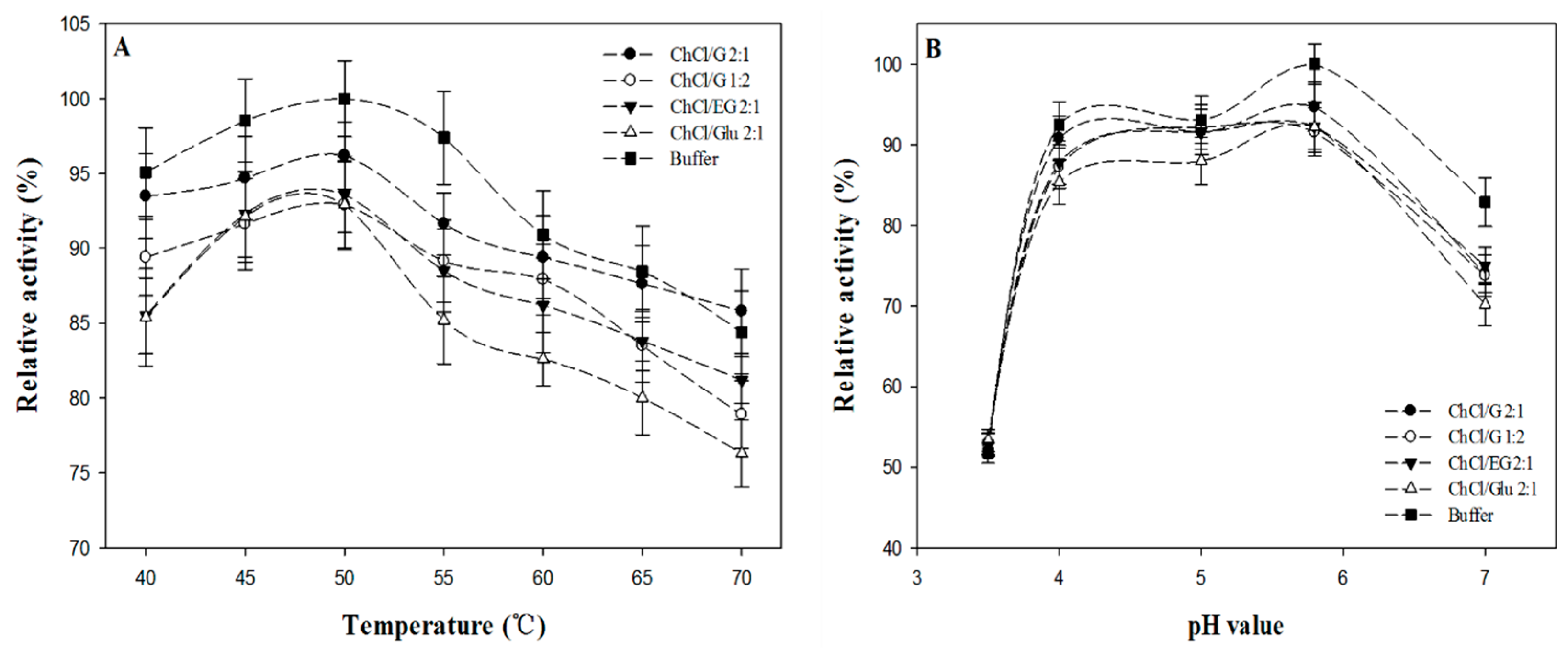 It is well known that pH and temperature of the environment significantly affect the catalytic activity of the involved enzymes [41]. The optimum pH and temperature could make the enzymatic performance more effective. Hence, we determined the influence of pH and temperature on the enzyme activity in four typical DESs (i.e., ChCl/G 2:1; ChCl/G 1:2; ChCl/EG 2:1 and ChCl/Glu 2:1, 20 vol %). The effect of DESs on the optimum temperature and pH of β-d-glucosidase were preliminarily investigated and the results were described in Figure 3. In the enzymology properties curve, we can find that optimal temperature was 50 °C and pH value was 5.0–5.8, which has no obvious alterations with the addition of DESs compared to that in pure buffer. This may be attributed to the fact that the structure of the enzyme has not been significantly damaged and the structure integrality is still maintained in the co-solvent. In the external medium, the optimum pH of the environment usually depended on the pH value of the buffer before freeze-drying, which is defined as “pH-imprinting” [43].