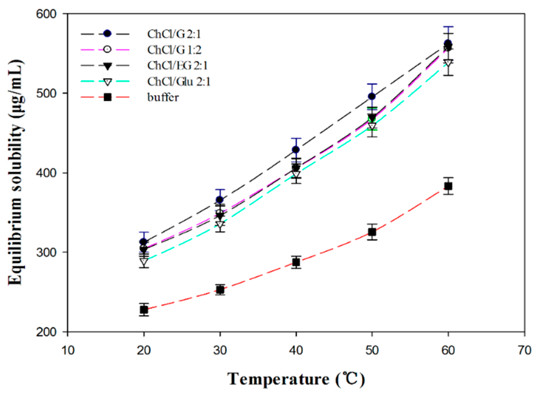 The tremendous capacity of DESs to dissolve polar substrates plays an important role in their availability for enzymatic reactions. The solubilities of daidzin in different DESs-containing solution (DESs-free buffer solution, ChCl/G 2:1, ChCl/G 1:2, ChCl/EG 2:1 and ChCl/Glu 2:1, 30 vol %) at various temperatures were presented in Figure 4. As can be observed, the solubility of daidzin in all the solvents increased obviously with the enhancement of the temperature, and the saturation concentration in ChCl/EG 2:1 reach to 556.7 μg/mL at 60 °C, while only 383.2 μg/mL in DESs-free buffer. The solubility showed dramatic enhancement (up to 1.5-folds) in ChCl/EG 2:1 compared with that in DESs-free buffer although the polarity of water was relatively higher. Overall, the solubility of daidzin in the screened typical DESs showed a high similarity and the variation tendencies with temperature were similar to each other. There are still some subtle differences in the solubility of daidzin in different DESs, the reasonable inference for the above phenomenon may be due to the differences in hydrogen bonding interaction although these polyols-based DESs possessed similar polarity. The results suggested that not only the solvent polarity but also other factors such as intermolecular interaction, and especially, the ability to form a hydrogen bond between the solvent and the solute as well as the physical properties of the solvent (e.g., viscosity and surface tension), could affect the solubility of the solute [44].