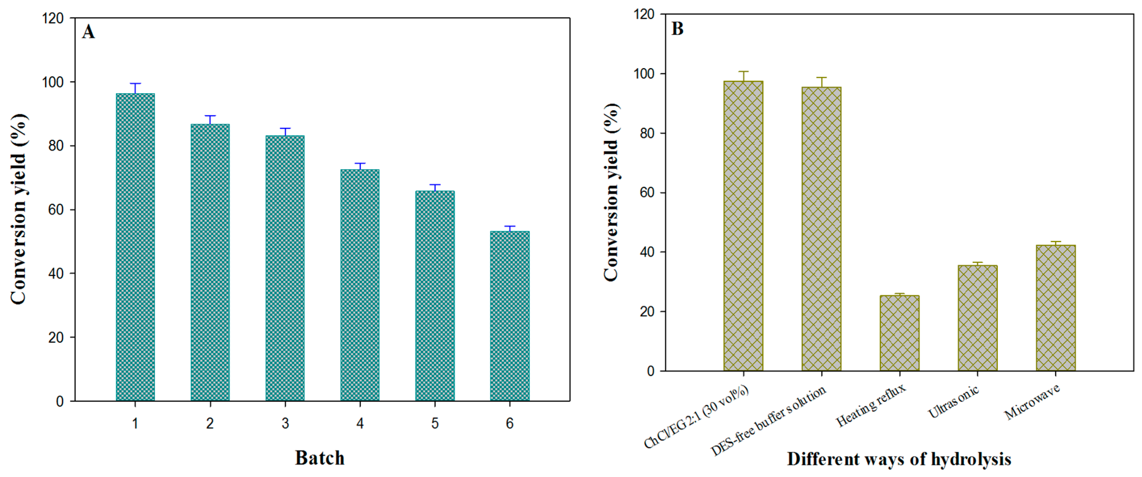 As shown in Figure 6A, the results illustrated that the same medium was used six times for the hydrolysis reaction, resulting in a small decrease in enzyme activity (conversion yield from 96.4% to 65.8%) for the first five recycling cycles. Thus, high stability of the enzyme in the medium and the high concentration of the substrate are responsible for the equilibrium shift towards daidzin hydrolysis, which may have contributed to the high repeatability. Consequently, the ChCl/EG 2:1 DES medium could allow us to carry out long-time and more complex reactions that enables us to provide a high productivity.