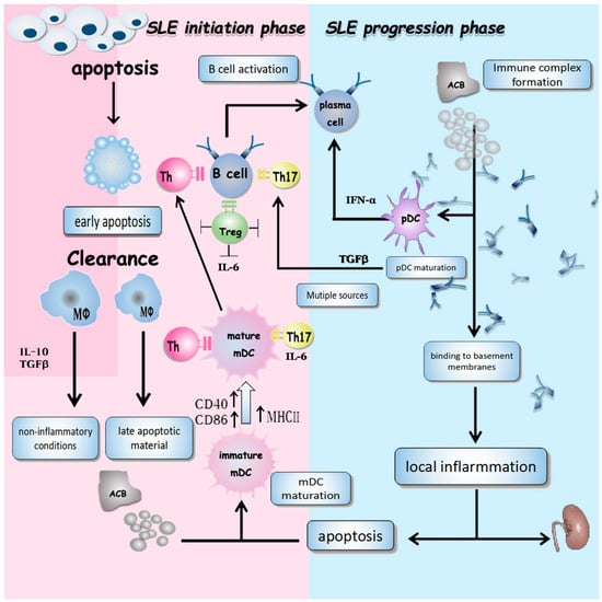 However, how exactly apoptosis contributes to SLE remains partially understood. In SLE, apoptotic blebs and nucleosomes are formed during apoptosis and become the source of auto-antigens. These cellular materials are taken up by immature myeloid dendritic cells (imDCs) undergoing maturation by expressing high levels of costimulatory molecules (CD86, CD40, and MHC-II) and pro-inflammatory cytokines, including IL-6 and IL-12p70. Mature DCs activate T helper 1 cells (Th1) and Th2 cells through CD86 and CD40 binding to their ligands. Moreover, mature DCs can also polarize naïve T cells (Th0) to Th1 cells under influence of IL-12p70. Under the effects of IL-6, regulatory T cells are inhibited whereas Th17 cell differentiation is promoted. With help from T cells, autoreactive B cells produce autoantibodies against self-antigens. Subsequently, autoantibodies are involved in forming immune-complexes (ICs) after binding to auto-antigens. In addition, after taking up ICs containing nucleic acids, plasmacytoid dendritic cells (pDCs) produce high amount of IFN-α, which then promote antibody production and isotype switching. ICs are deposited in renal tissue, resulting in immune cell infiltration and local tissue damage, which can further induce more apoptosis (Figure 1) [20] acting as a positive loop to break down immune tolerance and accelerate disease progression.