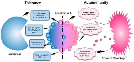 Under homeostasis, apoptotic cells are rapidly cleared by resident macrophages from tissues. Otherwise, accumulated apoptotic cells may induce either inflammation or immune responses leading to the breakdown of immune tolerance and autoimmune pathogenesis. Early apoptotic cells secrete anti-inflammatory cytokines, such as IL-10, TGF-beta, and express find-me (adenosine triphosphate (ATP), uridine triphosphate (UTP), dimer of ribosomal protein S19 (dRp S19)), eat-me (phosphatidylserine (PS), phosphatidylcholine (PC), phosphatidylethanolamine (PE)), and keep-out (Lactotransferrin (LTF)) signals to macrophages for tolerance induction [47]. Macrophages that have ingested apoptotic cells secrete ‘tolerate me’ cytokines, including transforming growth factor β (TGFβ) and IL-10, which create an anti-inflammatory milieu at the sites of cell death (Figure 2). Early studies have observed impaired phagocytic capacity of monocyte-derived macrophages from SLE patients [48,49,50,51]. Moreover, defective phagocytosis is also linked to decreased C reactive protein level and complement consumption in the sera of lupus patients [52].
