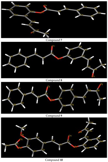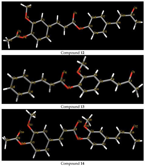 This result agrees with the dihedral angle of 8.2° between the two benzene rings in the structure of 1,7-bis(4-ethyloxy-3-methoxy-phenyl)-1,6-heptadiene-3,5-dione [17]. In contrast, the dihedral angle between the –O-phenyl ring and the central moiety varies from 63.3° to 88.2°. These features are shown in previous reports with α,β-unsaturated aromatic ester compounds [18,19,20,21,22], where aromatic, double bond, and ester groups are in a planar configuration and the substituents bonded to ester groups show some deviation. For structures 8 and 12 the dihedral angles show no significant difference.