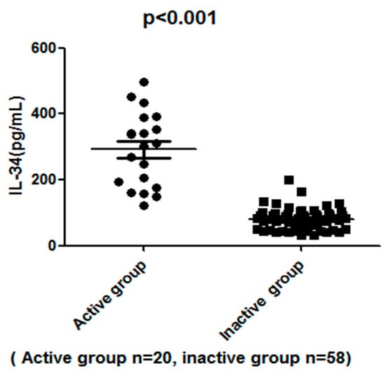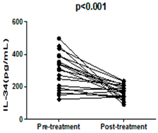 Serum IL-34 levels were significantly decreased after ameliorating the disease with treatment.