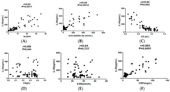 (A) Correlation of serum IL-34 concentrations with systemic lupus erythematosus disease activity index (SLEDAI) in all systemic lupus erythematosus (SLE) patients (n = 78). Spearman’s rank correlation coefficient was employed to assess correlations; p-values are shown; (B) Correlation of serum IL-34 concentrations with anti-double-stranded DNA antibody (anti-dsDNA Ab) in all SLE patients (n = 78). Spearman’s rank correlation coefficient was employed to assess correlations; p-values are shown; (C) Correlation of serum IL-34 concentrations with complement 3 (C3) in all SLE patients (n = 78). Spearman’s rank correlation coefficient was employed to assess correlations; p-values are shown; (D) Correlation of serum IL-34 concentrations with complement 4 (C4) in all SLE patients (n = 78). Spearman’s rank correlation coefficient was employed to assess correlations; p-values are shown; (E) Correlation of serum IL-34 concentrations with erythrocyte sedimentation rate (ESR) in all SLE patients (n = 78). Spearman’s rank correlation coefficient was employed to assess correlations; p-values are shown; (F) Correlation of serum IL-34 concentrations with C-reactive protein (CRP) in all SLE patients (n = 78). Spearman’s rank correlation coefficient was employed to assess correlations; p-values are shown.