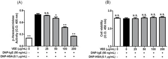 Cell viability was determined following a previous method [16]. IgE-sensitized RBL-2H3 cells were preincubated with VEE (0–200 μg/mL) in MEM-α containing 1% FBS for 1 h. The cells were then simultaneously mixed with 0.1 μg/mL DNP-HSA and 10 μL EZ-Cytox reagent and further incubated for 4 h. Cell viability was determined at 450 nm using a microplate reader.