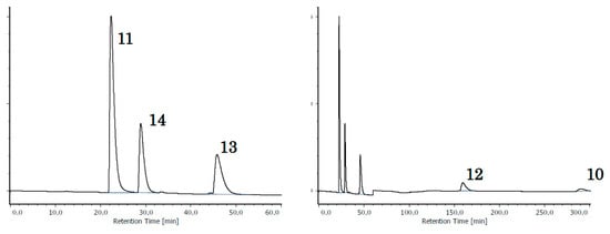 Chromatograms of isomeric acetyl phenanthrenes and anthracenes. Upper: On CHIRALCEL® OJ-H. Lower: On CHIRALCEL® OD-H. In each subfigure, the right side shows the total chromatogram and the left shows its 0–60 min range, enlarged. The elution order was totally inverse, except the one between 11 and 14. The mobile phase was a mixture of hexane and 2-propanol in 100:1 (v/v) ratio. For other conditions, see Section 3. Materials and Methods.