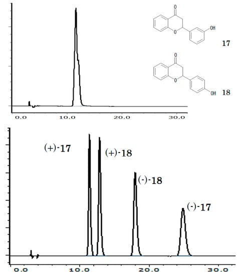 Chromatogram of racemic (±)-3'-hydroxyflavanone (17) and (±)-4'-hydroxy flavanone (18), upper on “OD-H” and lower on “AD-H”, each with hexane/ethanol/trifluoroacetic acid (80:20:0.1 v/v/v), 1.0 mL/min at 40 °C.