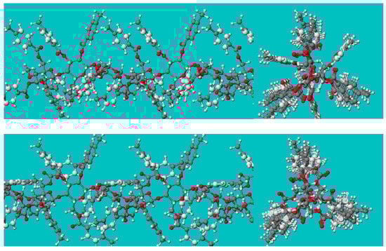 The structure of “OB-H” and “OJ-H” polymers, cellulose tribenzoate (CB) and cellulose tris(4-methylbenzoate) (CMB), respectively, were optimized starting from the coordinates of CB reported by Zugenmaier [], and two major energy minima were predicted for both derivatives (Figure 3). As is seen in the axial views, the 3-folded conformation of the cellulose backbone and the arrangement of 4-methylbenzoyloxy groups at glucosidic positions 2 and 3 are not much different, but the arrangement of the 4-methylbenzoyloxy group at glucosidic position 6 is quite different between the two conformers. In one conformer (Figure 3, upper, gg-conformer), the 4-methylbenzoyloxy group at this position is included in the line of those at positions 2 and 3, but in the other (Figure 3, lower, gt-conformer) it is out of the line, leaving a space in the line. In the perpendicular view to the molecular axis of the gt conformer, a space surrounded by glucopyranose rings and 4-methylbenzoyl groups can be seen. While in some reports concerning CMB [,] its gt-conformation was assumed, Zugenmaier had concluded that the gg-conformer is the deepest minimum of CB, and we obtained the same result for both CB and CMB. However, based on several considerations, we too predicted that the gt-conformer—which, we think, may be present at a certain population and/or under dynamic equilibria—must be the adsorption active form.
