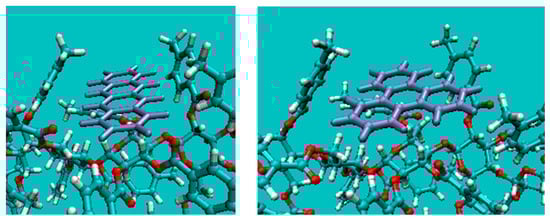The predicted association of cellulose tris(4-methylbenzoate) respectively with naphthacene (left) and triphenylene (right).