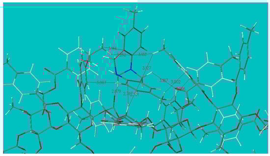 The predicted association of cellulose tris(4-methylbenzoate) and the more retained (5R, 11R)-(−)-enantiomer of Trӧger’s Base. Atoms close together are connected by a thin line and the atomic distance is given. The close stacking between aromatic ring and glucose ring is notable. The contribution of benzoyl methyl groups can rationalize why “OJ” can separate Trӧger’s base enantiomer but “OB” cannot, and that of the methyl group of Trӧger’s base can explain why substituting the methyl group with either hydrogen or chlorine deteriorates retention and chiral recognition [].