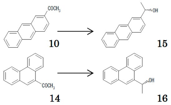 Relative retention (k’) of 2-acetylanthracene (10), 9-acetylphenanthrene (14), and the racemic alcohols 15 and 16 derived from each.