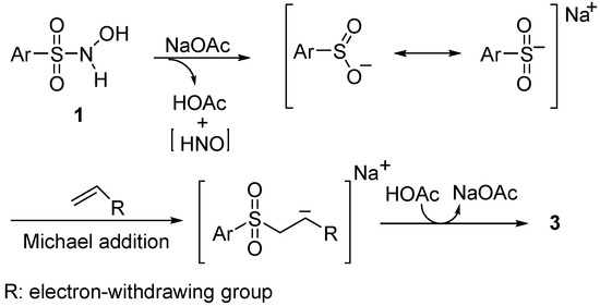 On the basis of the known decomposition of N-arylsulfonyl hydroxyamines under basic conditions to nitrosyl hydride and arylsulfinate [18], a proposed mechanism for the formation of alkyl aryl sulfones is shown in Scheme 2. It involves the formation of an arylsulfinate anion/arylsulfonyl anion intermediate [12], and its Michael addition with an electron-deficient alkene to afford alkyl aryl sulfone 3.
