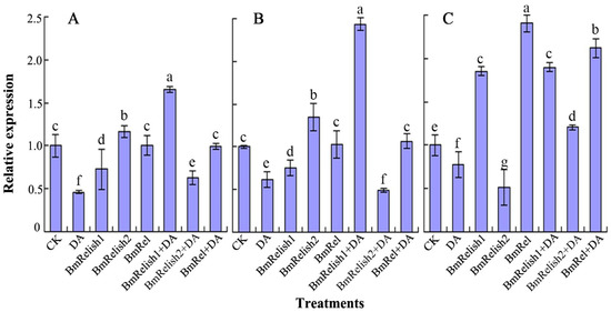 Furthermore, when the silence of the BmRelish1 gene and DA treatment were combined, Bm_nscaf2838_045 and Bm_nscaf2674_066 genes were significantly upregulated (Figure 2A,B). On the contrary, when the silence of the BmRelish2 gene and DA treatment were combined, the two genes were all significantly downregulated. However, after the silence of the BmRel gene was combined with DA treatment, the two gene expressions were not statistically different from the control (Figure 2A,B). For the Bm_nscaf2767_133 gene, the expressions were all upregulated in the treatments, except for the silence of BmRelish2 (Figure 2C).