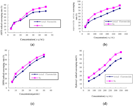 Effects of total flavonoids on radical scavenging rates: (a) Curve of ABTS scavenging rate; (b) curve of superoxide anion scavenging rate; (c) curve of DPPH radical scavenging rate; (d) curve of •OH scavenging rate.