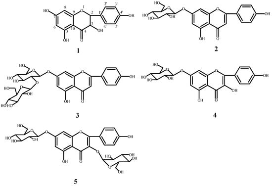 The structures of compounds: 1–5 (dihydrokaempferol (1); apigenin-7-O-β-d-glucoside (2); apigenin-7-O-β-d-neohesperidoside (3); kaempferol-7-O-β-d-glucopyranoside (4); kaempferol-3-O-β-d-glucopyranosyl-7-O-β-d-glucopyranoside (5)).
