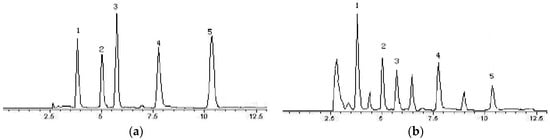 Chromatograms of chemical reference substances (a) and sample (b) in 360 nm (1—Apigenin-7-O-β-d-neohesperidoside (3); 2—kaempferol-3-O-β-d-glucopyranosyl-7-O-β-d-glucopyranoside (4); 3—kaempferol-7-O-β-d-glucopyranoside (5) 4—apigenin-7-O-β-d-glucopyranoside (2); 5—dihydrokaempferol (1)).