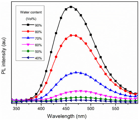 Photoluminescence (PL) spectra of PMT in THF-water mixtures with different water contents (λex = 310 nm, [P] = 1 mg·mL−1).