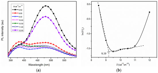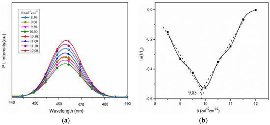 (a) PL spectra of PMT in mixed solvents with different solubility parameters (δ = 8.50~12.00 cal1/2cm−3/2, λex = 310 nm, [P] = 1 mg·mL−1); (b) Plots of ln(I/I0) of PL spectra (a).