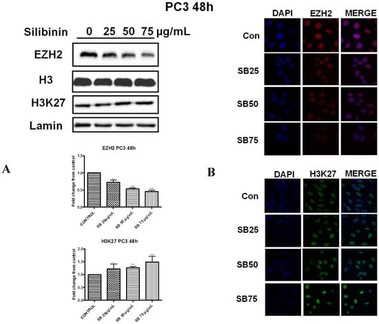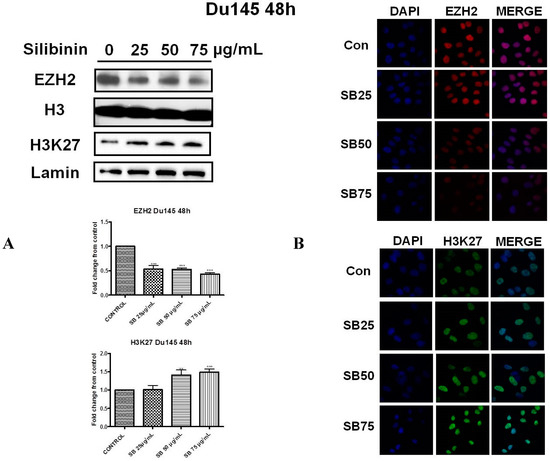 2.2. Silibinin Reduces EZH2 Expression While It Increases Trimethylation Levels of Lys27 on H3 (H3K27me3)