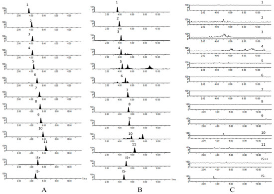 Active extraction MRM chromatograms of compounds 1–11, chloromycetin (IS−) and diphenhydramine (IS+): (A) blank plasma spiked with the 11 analytes and IS; (B) 15 min sample of plasma after a single oral dose of HYD; (C) blank plasma.