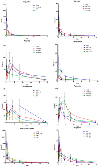 The drug combinations in traditional Chinese recipes can significantly influence the blood concentration and the pharmacokinetic parameters of the individual components after oral administration. In this study, the pharmacokinetic parameter data obtained for liquiritin, naringin, hesperidin, peimine, peiminine, liquiritigenin, glycyrrhizic acid, bergapten, nobiletin, osthole, and glycyrrhetinic acid in the different groups showed some significant differences.