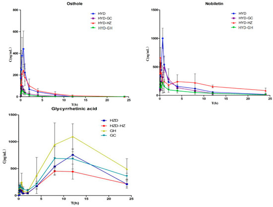 As shown in Table 9, the T1/2 of naringin, hesperidin, peimine and osthole in the HYD group changed significantly compared with the HYD-GH group. Gancao and Haizao drug combination prolonged elimination of the components in Chenpi, Qingpi, Beimu and Duhuo. In addition, an obvious decrease in the Tmax value of bergapten was detected. The herb Gancao and Haizao had a marked impact on the absorption of nobiletin and osthole. The Cmax of nobiletin and osthole as well as the AUC0~t of osthole were greatly reduced in group HYD-GH compared with group HYD.