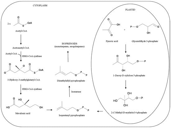 Mevalonic acid (MVA) pathway operates in the cytosol, but sub-cellular details are lacking, perhaps there is an involvement of endoplasmic reticulum (ER) and peroxisomes. It synthesizes sesquiterpene precursors (although in some instances there is a very small production of monoterpenes) (Figure 2).