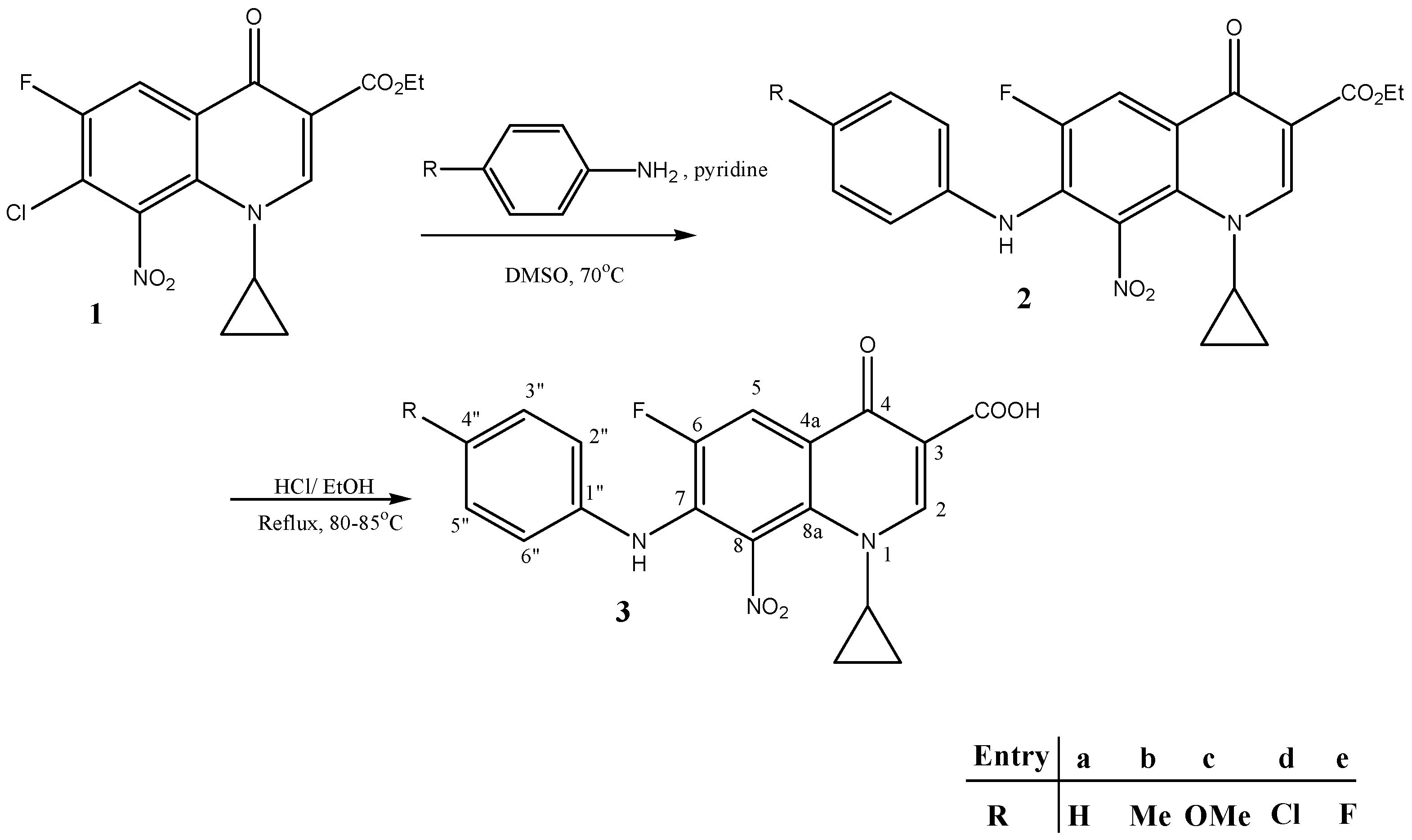 - Al-Hiari, Y.M.; Qandil, A.M.; Al-Zoubi, R.M.; Alzweiri, M.H.; Darwish, R.M.; Shattat, G.F.; Al-Qirim, T.M. Synthesis and antibacterial activity of novel 7-haloanilino-8-nitrofluoroquinolone derivatives. Med. Chem. Res. 2012, 21, 1734–1740. [Google Scholar] [CrossRef]