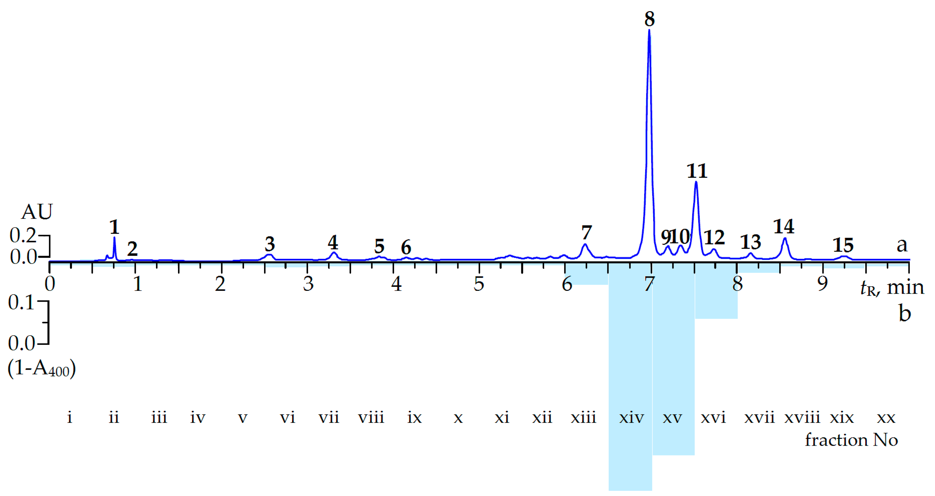 The microcolumn reversed phase HPLC chromatogram of (a) C. palustre extract at 270 nm and (b) (1-A400) values of fraction (i–xx) after post-column derivatization. Compounds: 1. 2-pyrone-4,6-dicarboxylic acid; 2. gallic acid; 3. α-pedunculagin; 4. β-pedunculagin; 5. procyanidin B3; 6. (+)-catechin; 7. potentillin; 8. agrimoniin; 9. ellagic acid; 10. rutin; 11. miquelianin; 12. isoquercitrin; 13. nicotiflorin; 14. astragalin; 15. afzelin. AU: absorption units; tR: retention time.