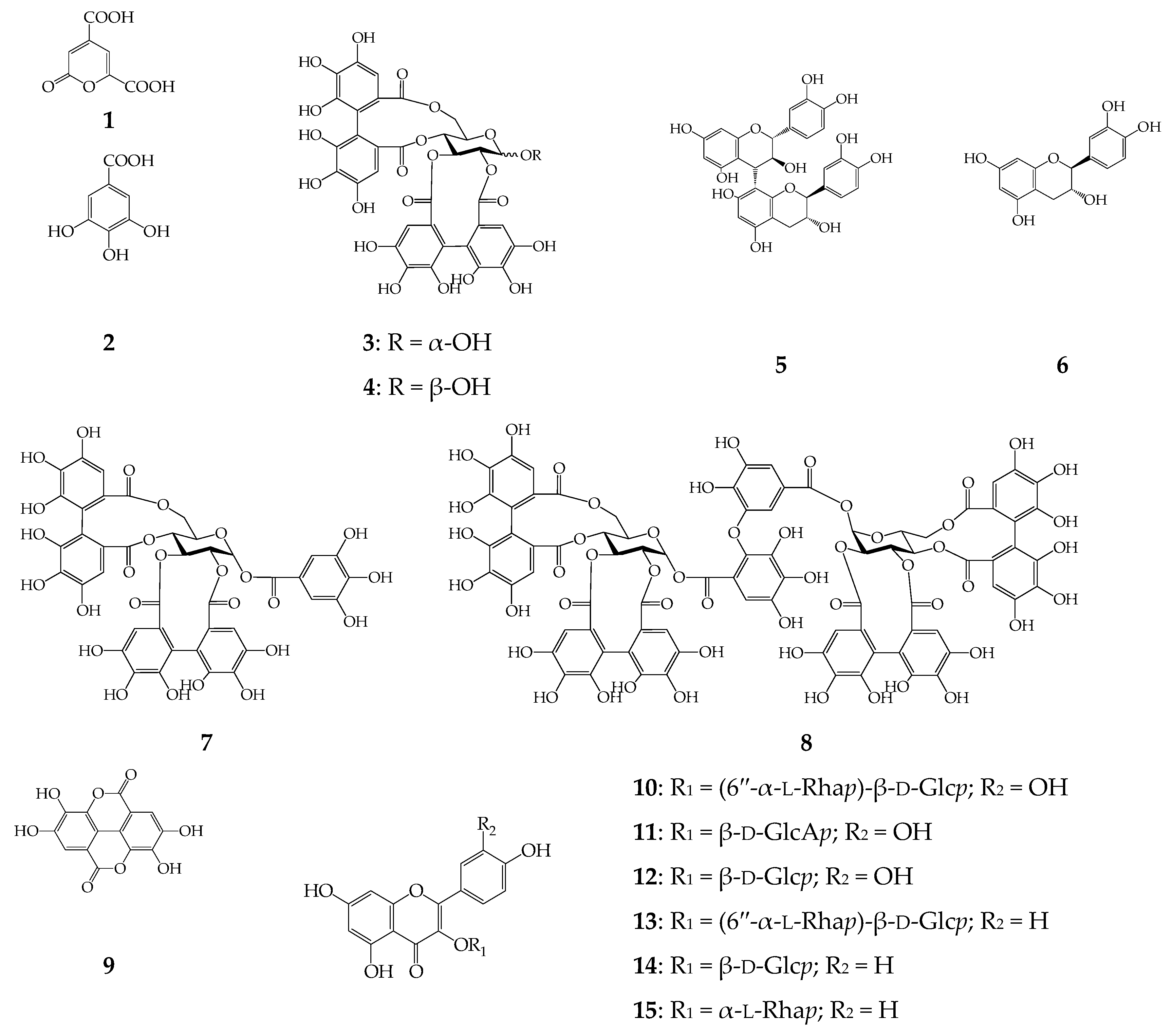 Chemical structures of compounds 1–15 detected in C. palustre extract. β-d-Glcp—β-d-glucopyranose; β-d-GlcAp—β-d-glucuronopyranose; α-l-Rhap—α-l-rhamnopyranose.